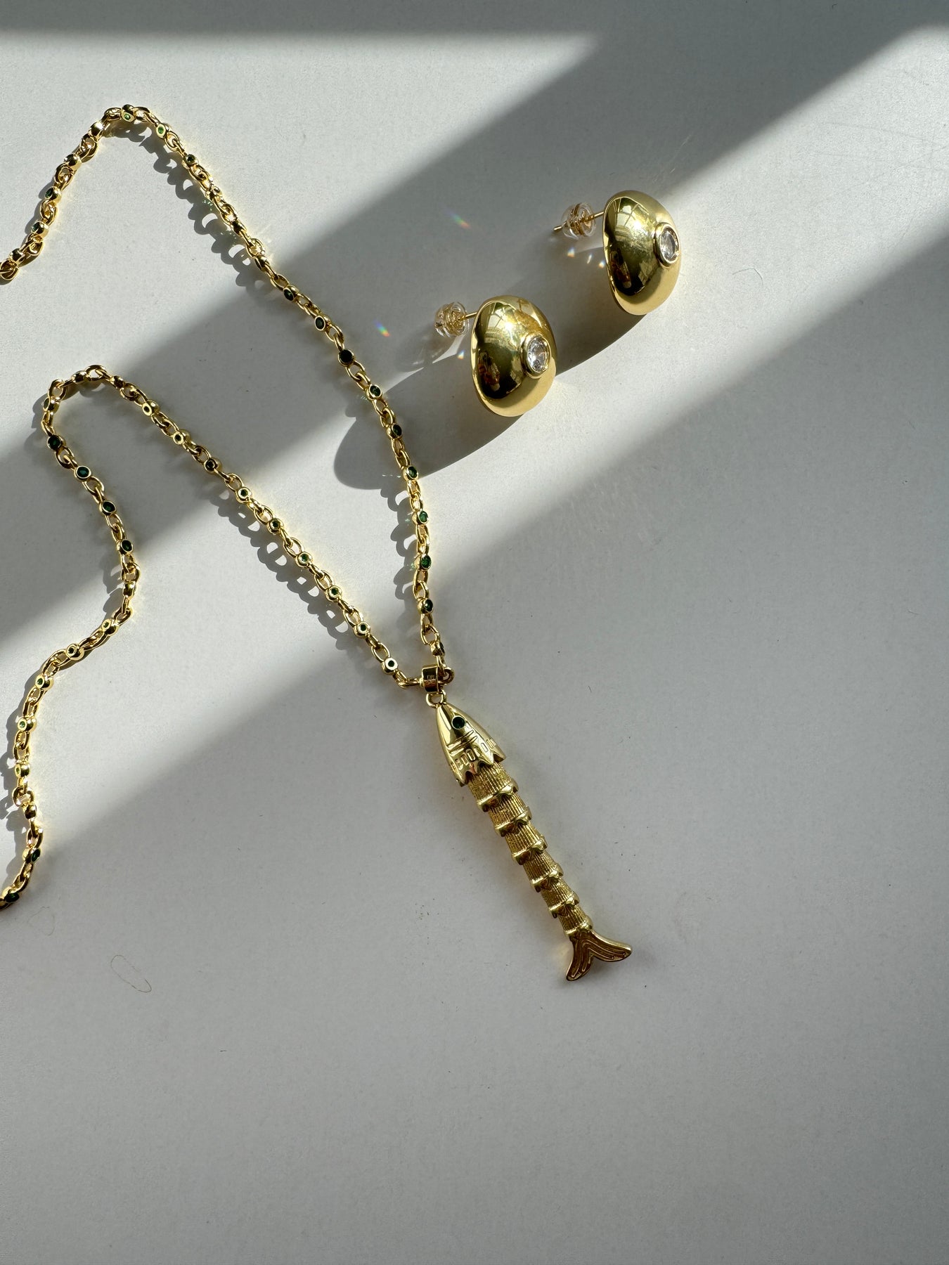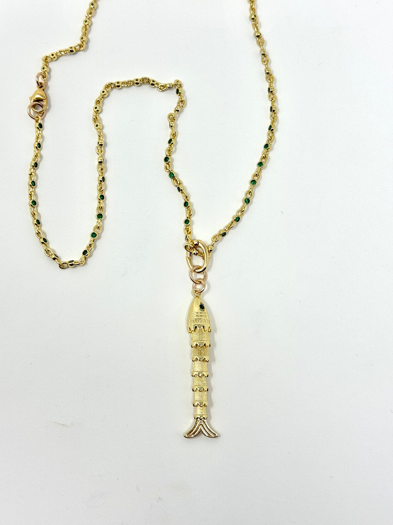 The Abundance Necklace.  Delicate green cz chain with movable fish charm pendant.  Fish is removable as a charm.
