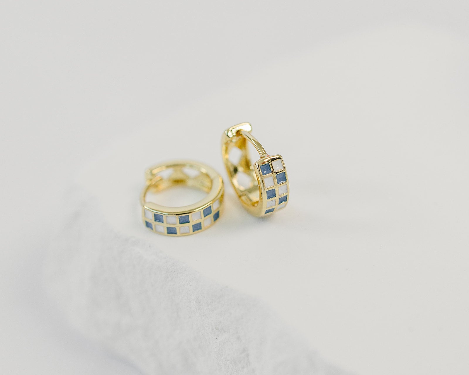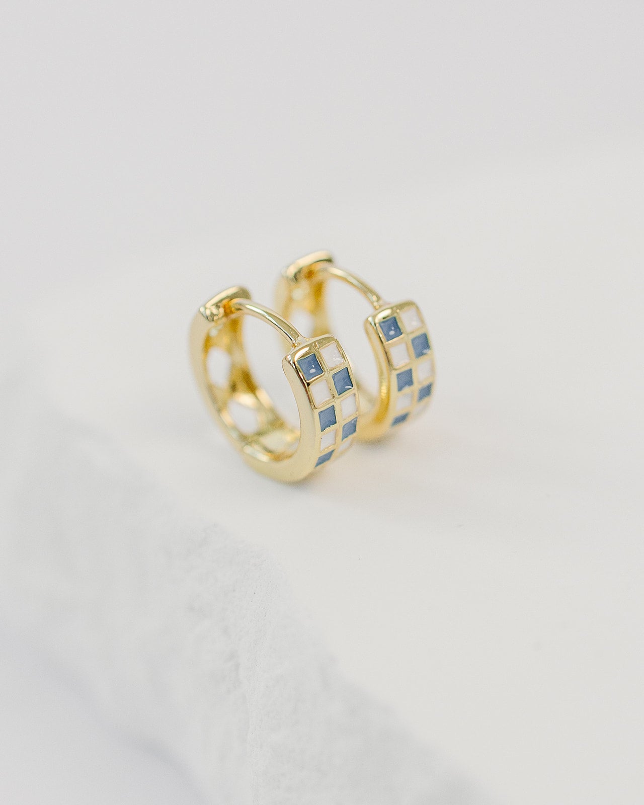 Blue Crush Earrings . Blue and White checkerboard pattern huggie hoops.