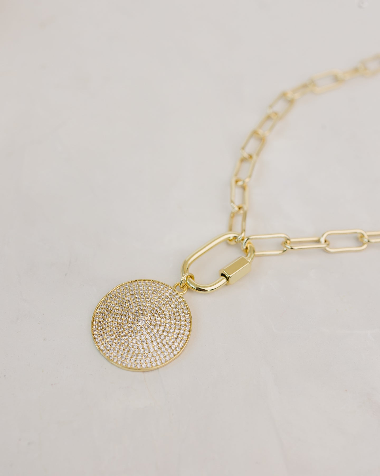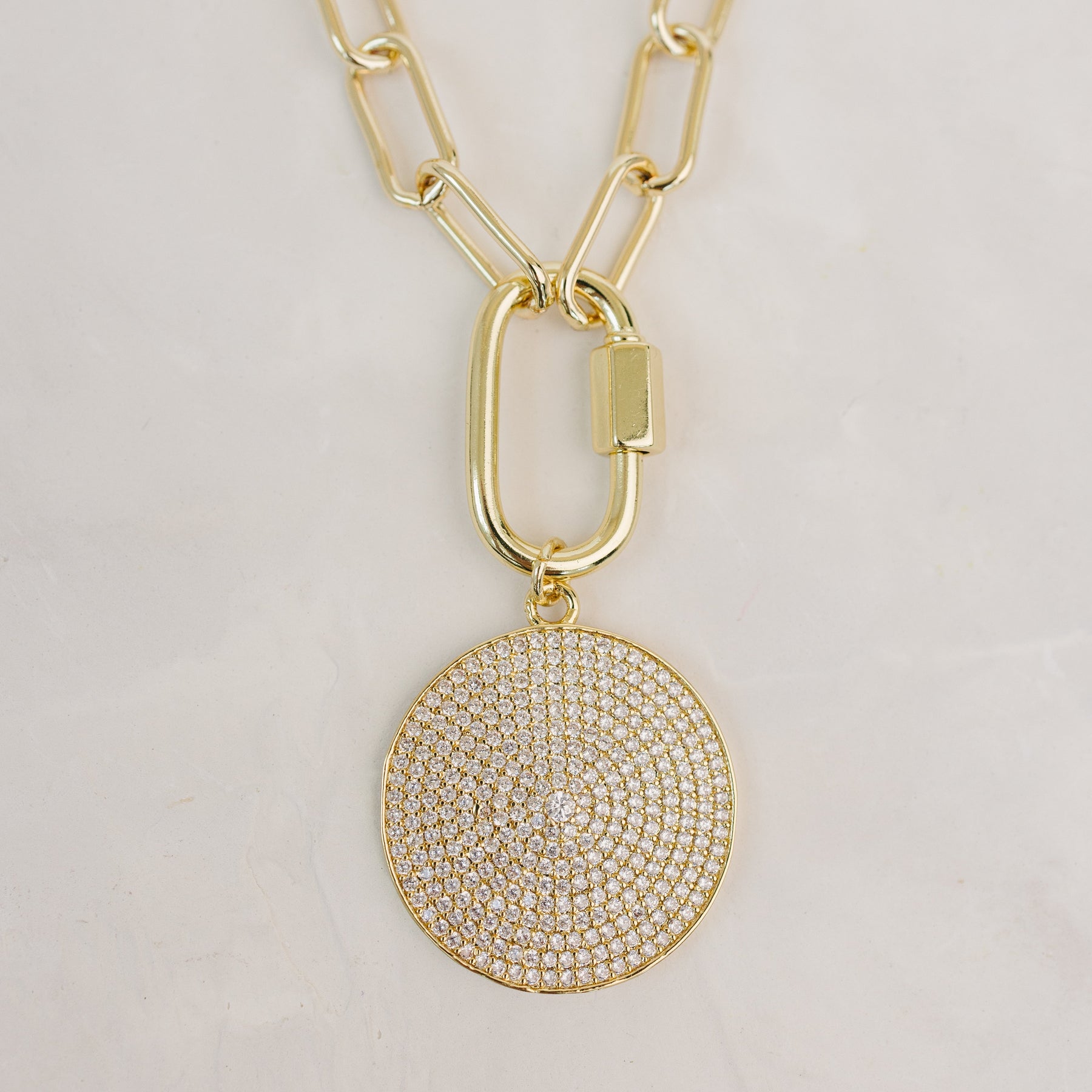 Celebrate Necklace .  Pave cz pendant on a paperclip gold filled chain.  The pendant is easily removed for day to evening versatility.  Clasps in the front with the screw carabiner.
