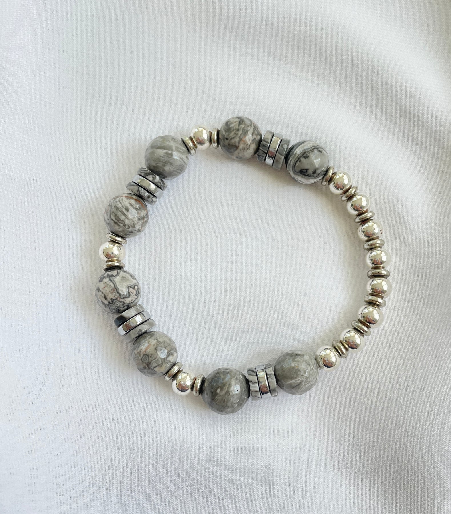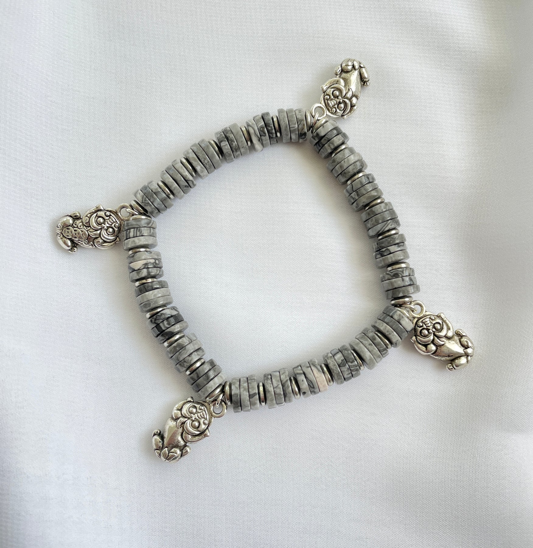 Courage and Strength Stack Bracelets . Gray picture jasper stones of jasper, druzy with matching silver accent beads. Tibetan lion charm the symbol of strength and courage.