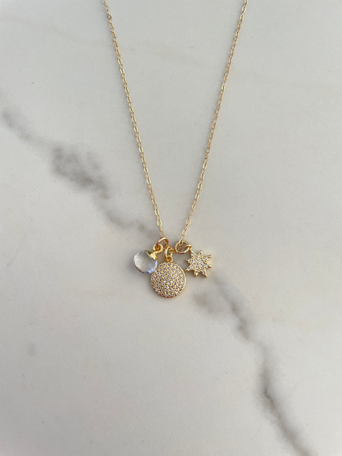 The Steamboat Necklace. Charmed with sparkle. Clear quartz briolette, round cz disk and a pave cz star.