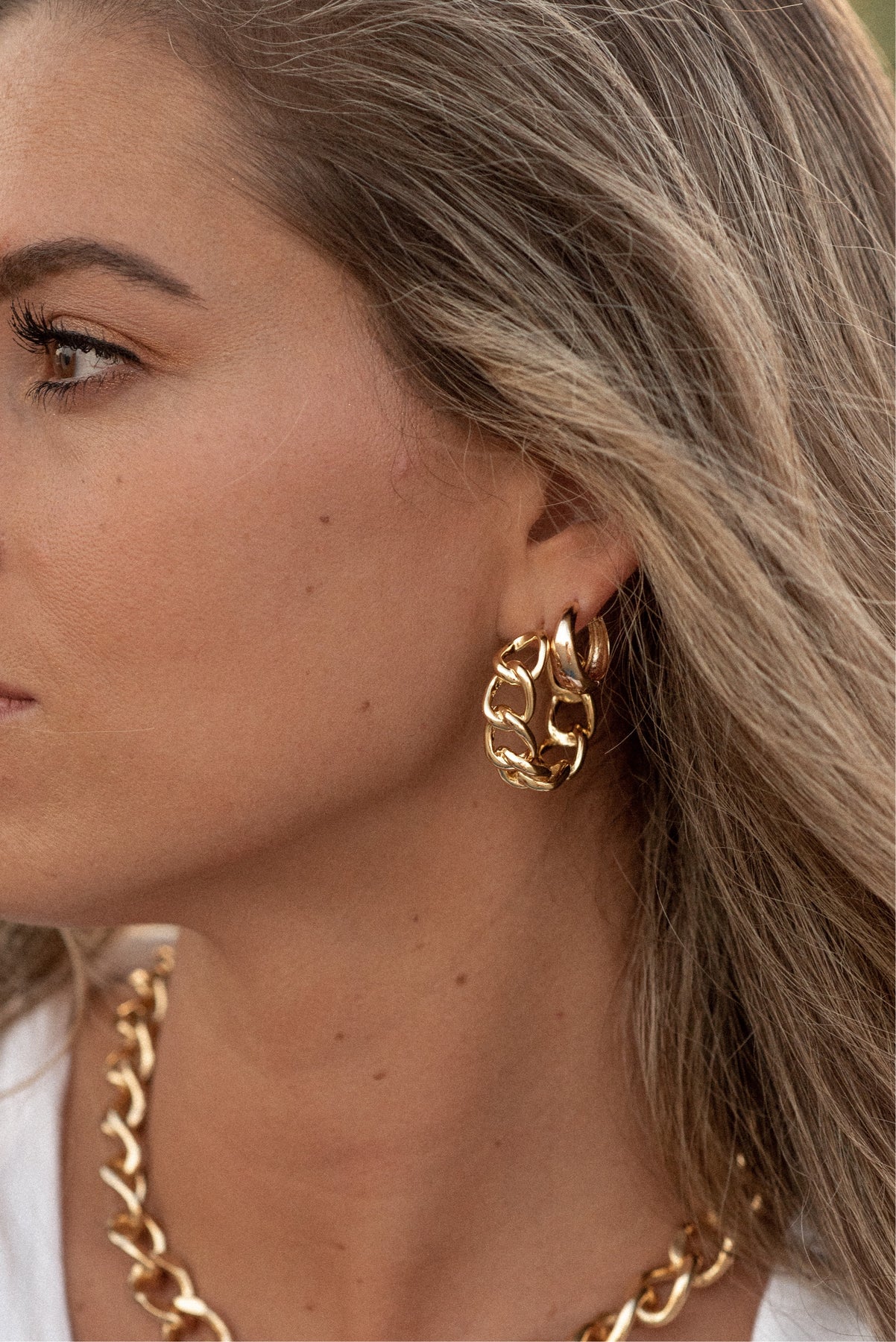 Wide Chain Gold hoop earrings celebrate a classic look with a modern update.